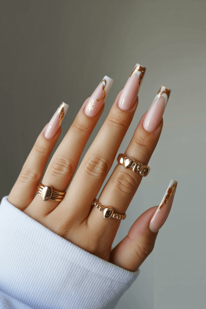 Goldene Details verleihen den Nägeln Luxus.