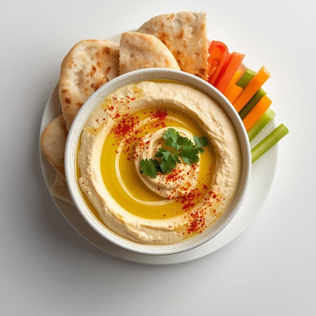 - Hummus: Reich an pflanzlichem Eiweiß, Ballaststoffen und gesunden Fetten.