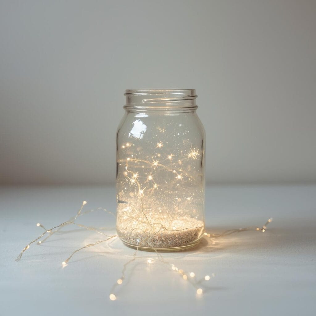 Die Verwendung von Kunstschnee und Glitzer schafft eine festliche Stimmung. Sie können auch kleine weihnachtliche Figuren oder Konfetti hinzufügen, um das Design weiter zu personalisieren. Eine Lichterkette sorgt dafür, dass das Glas an jedem Abend ein schönes Lichtspiel erzeugt und somit eine wunderbare Atmosphäre schafft – perfekt für die Weihnachtszeit.