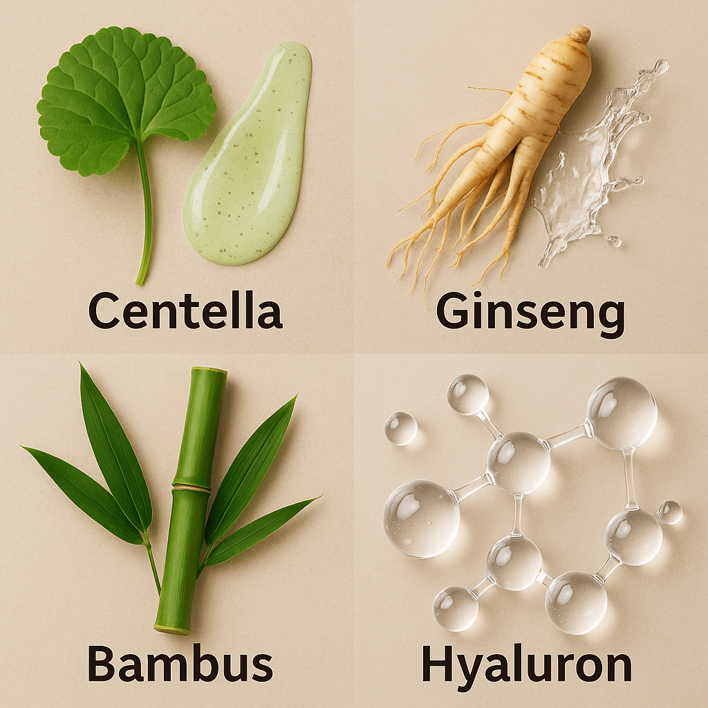 - Natürliche Inhaltsstoffe wie Centella Asiatica, Grüntee oder Bambus