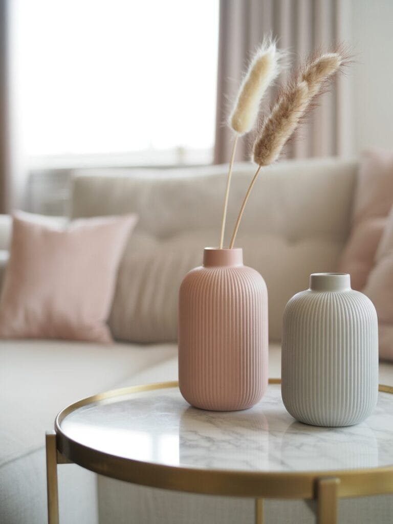 Pastellfarbene Vasen mit zarten Strukturen oder glänzenden Oberflächen lassen sich wunderbar mit goldenen Schalen oder Kerzenständern kombinieren. Sie setzen dezente Highlights auf Sideboards, Fensterbänken oder Esstischen.