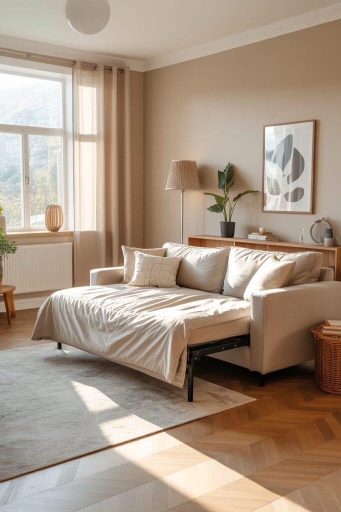 Ein Schlafsofa in neutralem Grau oder Creme wirkt edel und lässt sich saisonal mit wechselnden Kissenfarben immer wieder neu gestalten.