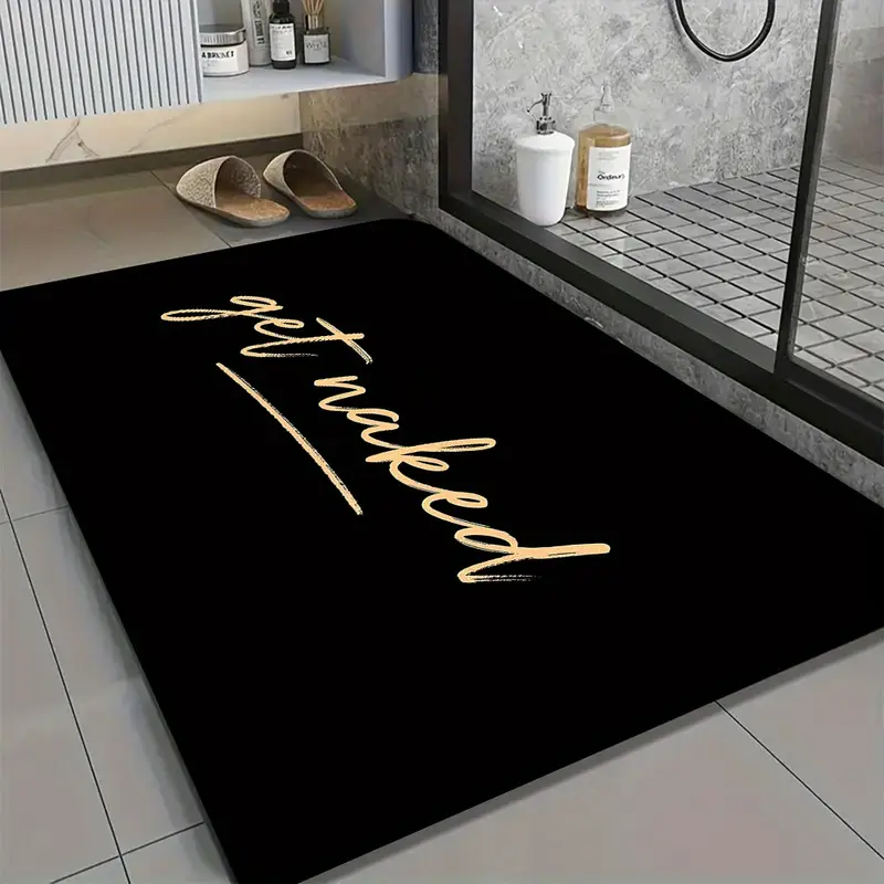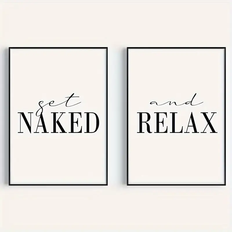 - Minimalistische Wandbilder mit Schriftzügen („Relax“, „Get Naked“)