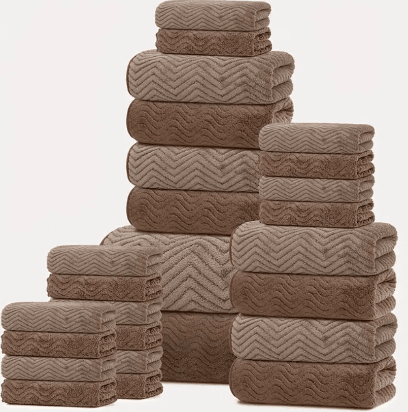 - Handtücher in sanften Naturfarben (z. B. Sand, Creme, Eukalyptusgrün)