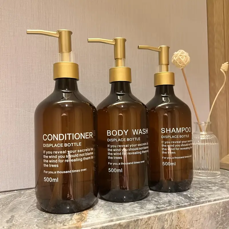 - Amberfarbene Pumpflaschen mit schwarzem oder goldenem Detail