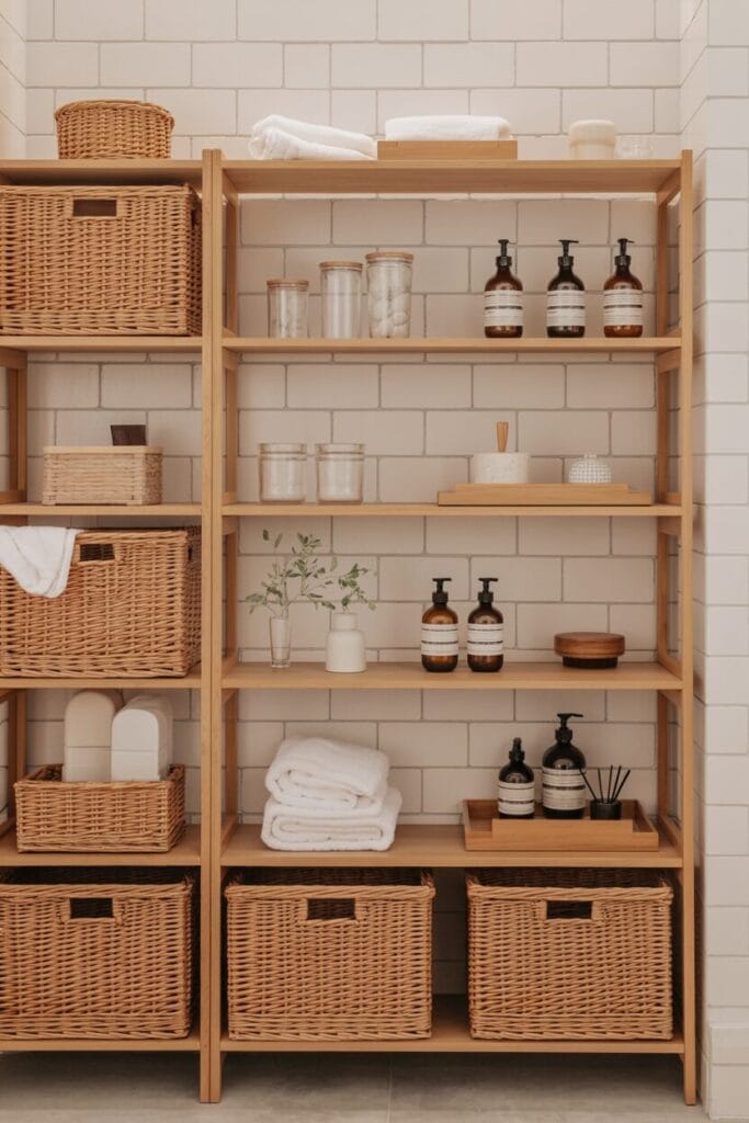 Setze auf offene Regale aus hellem Holz, geflochtene Körbe und Spender in Braunglas-Optik. Sie wirken edel und sorgen gleichzeitig für Ordnung.