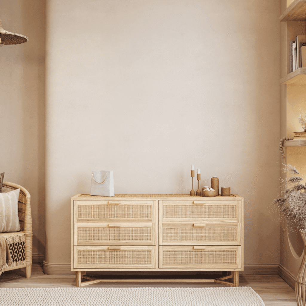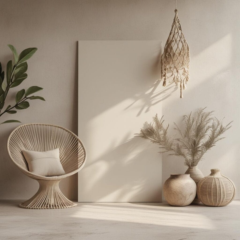 Setze auf Naturmaterialien wie Holz, Rattan, Leinen, Baumwolle, Jute und Keramik. Diese Materialien verleihen deinem Boho-Style Wohnzimmer eine warme, gemütliche Ausstrahlung.